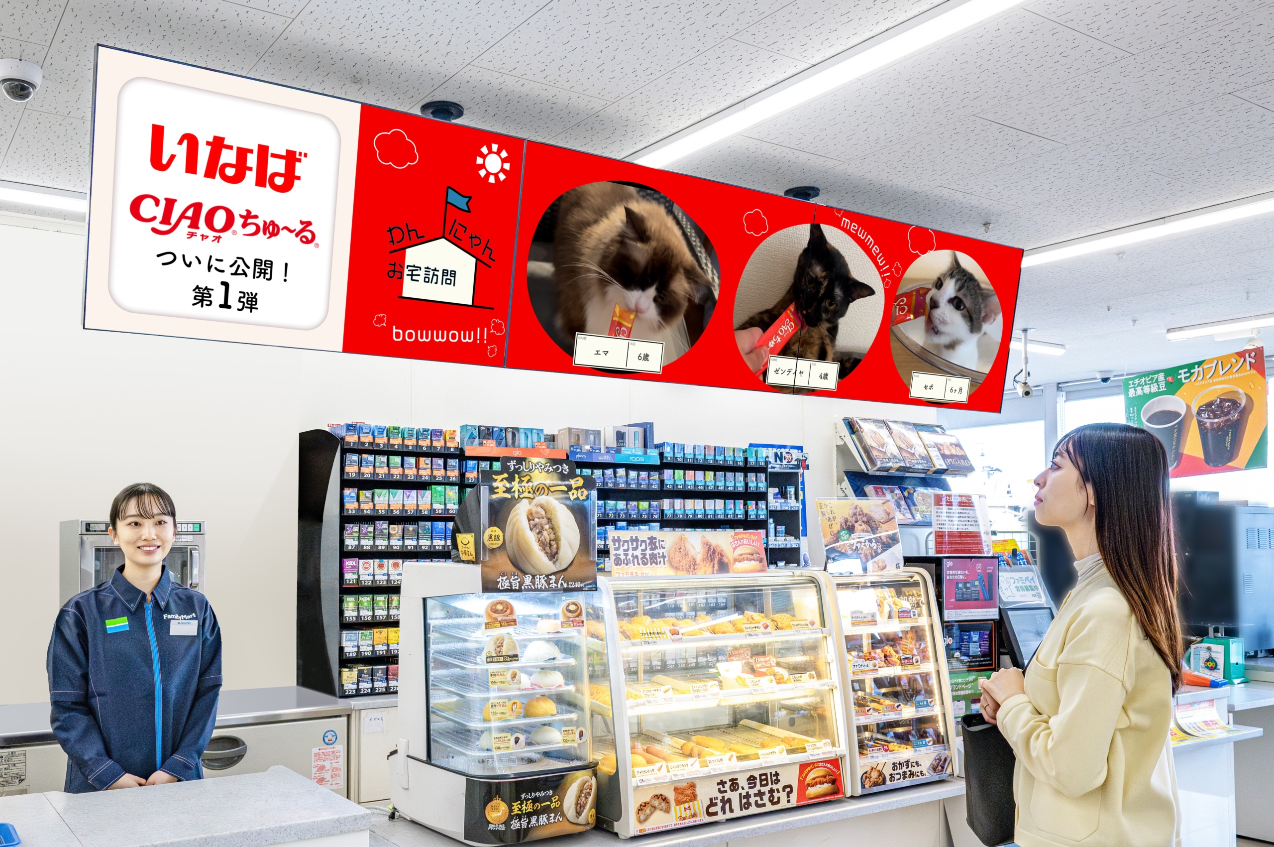 株式会社ファミリーマート(本社:東京都港区、代表取締役社長:細見研介)、株式会社ゲート・ワン(本社:東京都港区、代表取締役社長CEO:藏田 一郎)、株式会社データ・ワン(本社:東京都千代田区、代表取締役社長:国立 冬樹)は、いなばペットフードの「ちゅ〜る」と、ご家庭のペットを紹介する人気番組「わんにゃんお宅訪問」がコラボしたユーザー参加型企画「わんにゃんお宅訪問 with ちゅ〜る」の放映を、2025年12月16日(火)から、一部店舗を除く全国のファミリーマート約10,600店舗に設置のデジタルサイネージ「FamilyMartVision」にて開始いたします。当番組は、FamilyMartVisionのオリジナル番組としては初となる、企業のタイアップ企画となります。