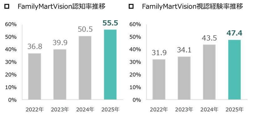 FamilyMartVisionの認知率は、2022年の初回調査時に36.8%だったものが、昨年に実施した調査では55.5%となり、3年間で約20pt上昇しました。さらに、「見たことがある、見たことがある気がする」を示す視聴経験率は2022年11月に31.9%であったものが、今回の調査では47.4%となり、16pt上昇しました。
